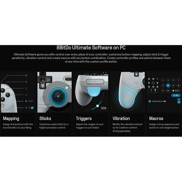 | Besonderheiten | Optimierte Handgriffe, 2 zusätzliche Tasten auf der Rückseite, Anpassbare Turbo-Funktion, 8BitDo Ultimate Software (Tastenbelegung, Stick- & Trigger-Empfindlichkeit, Vibrationsstärke, Makros), 3 Profile On-Board speicherbar | ||