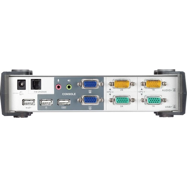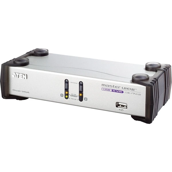 Der KVM-Switch CS1742C von ATEN ist die Lösung um zwei Dual-VGA-Computer mit nur einer Tastatur, Maus und Bildschirm zu steuern. Die Bedienung erfolgt sehr komfortabel per Hotkey an der Tastatur oder über Taster am Switch mit vier LEDs, die den aktuellen Status anzeigen. Die Computer werden jeweils mit einer USB-Buchse und zwei VGA-Buchsen sowie Audio-Anschlüssen mit dem CS1742C verbunden, der wiederrum zwei USB-Buchsen, und zwei VGA-Buchsen für die gemeinsame Tastatur, Maus und den Bildschirm bereitstellt. Zudem verfügt der CS1742C über einen USB-Hub mit zwei Ports.Art.-Nr.: 783122