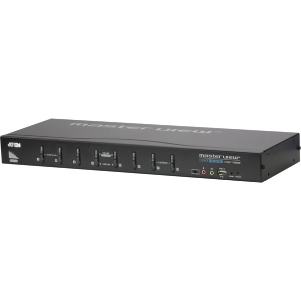 Der KVM-Switch CS1768 von ATEN ist eine Lösung um acht Computer mit nur einer Tastatur, einer Maus und einem Bildschirm zu steuern. Die Bedienung erfolgt sehr komfortabel an der Tastatur oder mit Tastern direkt an dem CS1768 mit acht LEDs, die den aktuellen Status anzeigen. Der CS1768 bietet für den Anschluss von Peripheriegeräten (Tastatur, Maus und Bildschirm) zwei USB-Buchsen und einen DVI-Anschluss. Die Computer werden mittels eines KVM-Kabels mit dem CS1768 verbunden. Dieses Kabel stellt je einen DVI-Anschluss, einen USB-Anschluss und Audio-Anschlüsse für die Rechner zur Verfügung. Zusätzlich stellt der CS1768 über einen USB-Hub mit zwei Ports für USB-Geräte sowie einen Headset-Anschluss zur Verfügung.Art.-Nr.: 938728