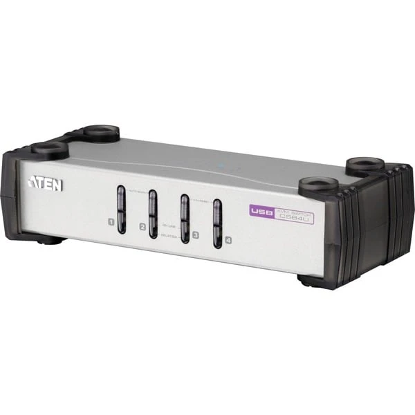 Der KVM-Switch CS84U von ATEN ist eine Lösung um vier Computer mit nur einer Tastatur, einer Maus und einem Bildschirm zu steuern. Die Bedienung erfolgt sehr komfortabel an der Tastatur oder mit Tastern direkt an dem CS84U mit vier LEDs, die den aktuellen Status anzeigen. Der CS82U bietet für den Anschluss von Peripheriegeräten (Tastatur, Maus und Bildschirm) zwei PS/2-Buchsen, zwei USB-Buchsen und einen VGA-Anschluss. Die Computer werden mittels eines KVM-Kabels mit dem CS84U verbunden. Dieses Kabel stellt jeweils einen VGA-Anschluss mit zwei PS/2-Anschlüssen und einem USB-Anschluss für die Rechner zur Verfügung. So kann die Anschlussart pro Rechner individuell gewählt werden.Art.-Nr.: 783760