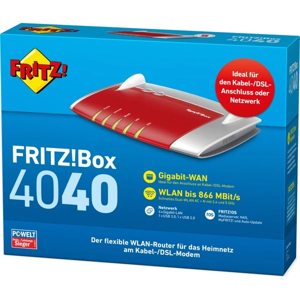 Mit der FRITZ!Box 4040 erweitert AVM die Reihe der FRITZ!Box-Router ohne integriertes Modem um ein neues Spitzenmodell. Die FRITZ!Box 4040 lässt sich als schneller WLAN AC-Router an jedem vorhandenen Netzwerk oder einem beliebigen DSL-, Kabel- oder Glasfaser-Modem einsetzen. Auch UMTS-, HSPA- und LTE-Sticks für den Internetzugang werden unterstützt. Mit gewohntem Komfort verbindet die FRITZ!Box 4040 sämtliche Computer, Smartphones, Tablets und weitere netzwerkfähige Geräte untereinander und mit dem Heimnetz.Art.-Nr.: 1297245