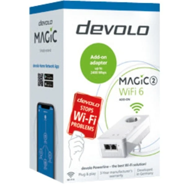 Der Magic 2 WiFi 6 Powerline-Adapter sorgt mit bis zu 50 Prozent mehr WLAN-Power als herkömmliche WLAN 5-PLC-Adapter für Hohe Geschwindigkeiten im heimischen Netzwerk. Der devolo Magic 2 WiFi 6 erreicht Geschwindikeiten von bis zu 1800 Mbit/s (WLAN) und stellt diese jedem Nutzer zur Verfügung. Denn dank OFDMA werden die Kanäle flexibel genutzt: Bestes WLAN für alle – beim Senden, Empfangen und auch bei vielen parallelen Nutzern. Die Verteilung des Internetsignals erfolgt per Powerline-Technologie sogar mit bis zu 2400 Mbit/s (LAN) direkt über die Stromleitung in jeden Raum. Mit einem Adapter wird jede Steckdose zum Access Point für leistungsstarkes Multiroom-WiFi. Und mehrere devolo Magic-Adapter verbinden sich ganz von allein zu einem lückenlosen Mesh-Netzwerk.Art.-Nr.: 1794506