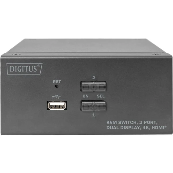 Der Digitus KVM-Switch DS-12860 ist ein günstiger 2-Port KVM-Switch mit automatischem Audioumschalter für den Desktopbereich. Der Anschluss des KVM erfolgt per USB (Tastatur / Maus), 2x 3,5mm Klinke (Audio Mic/Line) und Dual HDMI-Monitor über die zwei mitgelieferten Anschlusskabel sowie zwei weitere HDMI-Kabel an die Computer. Über den zusätzlichen USB-Port in der Front lassen sich zudem externe Datenträger, wie z.B. USB-Sticks, anschließen und verwalten.Art.-Nr.: 1805918