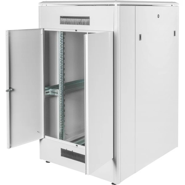 | Kabelführung | 800 mm breite Schränke ab 32HE sind ausgestattet mit vertikalen Kabelführungskanälen vorne, aufschiebbarer Kabeleinlass mit Moosgummidichtung im Boden, Kabeleinlass mit Boden und Dach mit Bürstenleiste links und rechts (bei Schränken ab 800 mm Breite), Kabeleinlass mit Bürstenleiste an der oberen und unteren Schrankrückseite (bei Schränken ab 26HE) | ||