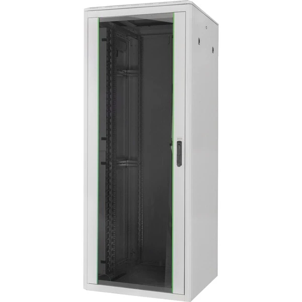 Die Netzwerkschränke der Varioflex-N Serie wurden für eine optimale Verkabelung von Netzwerkkomponenten designt und produziert. Durchdachte Optimierungen bieten marktkonforme Stabilität bei maximaler Flexibilität. Die Fronttür, bestehend aus einem kompletten Metallrahmen mit 4 mm starkem Hartglas sowie die doppelflügelige Stahl-Rücktür sind ausgestattet mit einem Schwenkgriff inklusive Profilhalbzylinder-Schloss (DIN 18 252 (EN 1303)). Beide Seitenwände sind abschließ- sowie abnehmbar. Im Inneren des Schrankes sind vier verkröpfte, galvanisierte 19″-Profile integriert, welche an mehreren Stellen über Tiefenstreben mit dem Grundgerüst des Schrankes verbunden sind. Sie sind tiefenverstellbar und besitzen eine Markierung der jeweiligen Höheneinheit, lesbar in beide Richtungen. Ein modular, durch verschraubte Blindplatten öffenbares Bodenchassis bietet ausreichend Platz für Kabel aller Art. Desweiteren befinden sich jeweils zwei Kabeleinlässe mit Bürste oben und unten im Schrank. Großzügige vertikale Kabelkanäle mit Kabelführungshilfen aus Kunststoff und Blende, verbaut in der Frontseite, runden die vielfältigen Eigenschaften des Netzwerkschranks einwandfrei ab.Art.-Nr.: 100005830