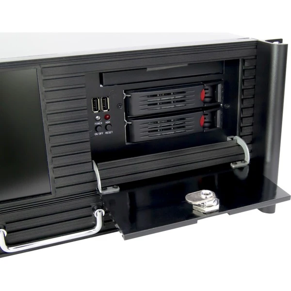 Das Inter-Tech 4U-4452-TFT ist ein Server-Gehäuse mit TFT Bildschirm und Tastatur/Mousepad Schublade. Die Slim-DVD Befestigung ist mit wenigen Handgriffen entnehmbar und ermöglicht eine entspannte Montage/Demontage eines Slim-DVD Laufwerks. Hinter der abschließbaren Frontklappe des Gehäuses befinden sich zwei Hot-Swap Festplattenrahmen für wahlweise 2,5″ oder 3,5″ Laufwerke, welche zudem die externen Laufwerke und USB-Ports vor unbefugtem Zugriff schützt.Art.-Nr.: 1569927