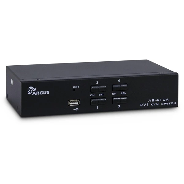Der KVM AS-41DA DVI ist ein günstiger 4-Port KVM-Switch mit automatischem Audioumschalter für den Desktopbereich. Der Anschluss des KVM erfolgt per USB (Tastatur / Maus), 4x 3,5mm Klinke (Audio Mic/Line) und DVI-I oder DVI-D über die 4 mitgelieferten Anschlusskabel, an die Computer.