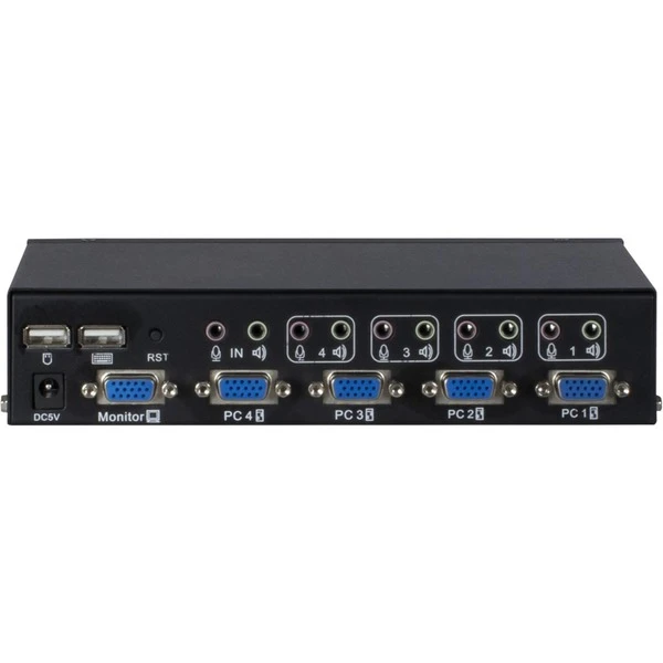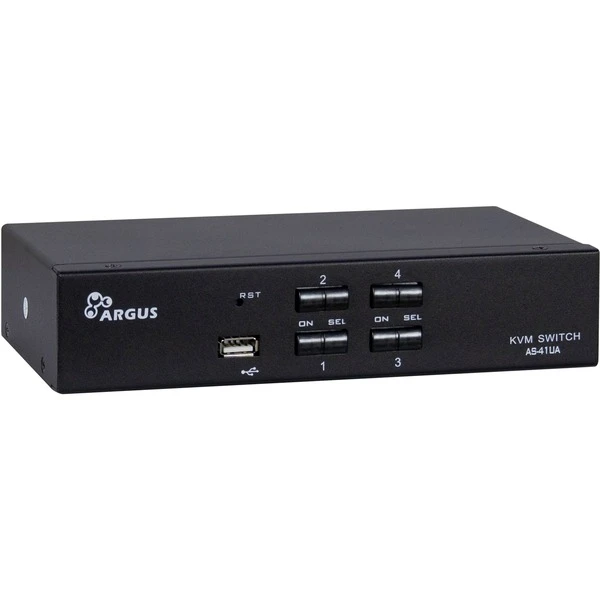 Der KVM AS-41UA VGA ist ein günstiger 4-Port KVM-Switch mit automatischem Audioumschalter für den Desktopbereich. Der Anschluss des KVM erfolgt per USB (Tastatur / Maus), 8x 3,5mm Klinke (Audio Mic/Line) und DB15 (VGA Monitor) über die 4 mitgelieferten Anschlusskabel, an die Computer. Über die beiden zusätzlichen USB-Ports in der Front lassen sich zudem externe Datenträger, wie z.B. USB-Sticks, anschließen und verwalten.