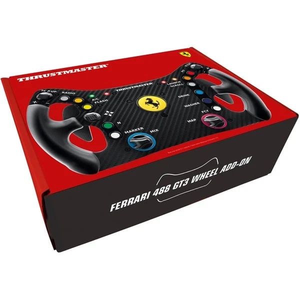 Bei dem Thrustmaster Ferrari 488 GT3 Wheel Add-On handelt es sich um eine Lenkrad-Replika im Maßstab 1:1 von Ferraris erfolgreichstem Rennwagen der Geschichte: dem Ferrari 488 GT3, der in GT- und Langstreckenmeisterschaften zum Einsatz kam und über 500 Siege erzielte. Das Lenkrad ist dabei offiziell lizenziert von Ferrari und mit allen aktuellen und zukünftigen Thrustmaster-Servobasen mit abnehmbarem Lenkrad kompatibel. Zwei mitgelieferte Quick-Release-Halterungen ermöglichen es, die entsprechende Halterung an der Basis ohne zusätzlichen Adapter zu befestigen. Das Ferrari 488 GT3 Wheel Add-On verfügt über vier LEDs für Renndaten und Drehzahl mit GT- oder Einsitzer-Modus zur Anpassung an die fahrzeugspezifische Motordrehzahl. Die karbonbeschichtete Frontplatte sorgt für eine Gewichtsoptimierung und kraftvolles, präzises Force Feedback, das die Leistung der Servobasis voll zur Geltung bringt. Elf Aktionstasten mit authentischem Feeling und ein nahtlos integriertes D-Pad, das dem Design des Original-Lenkrads entspricht, sind ebenfalls vorhanden. Zudem dienen zwei Dreh-Encoder und zwei Daumen-Encoder zur schnellen Änderung von Einstellungen während der Fahrt. Die einstellbaren Metall-Schaltwippen mit Magnetsensoren können in vier Positionen angepasst werden.Art.-Nr.: 100018266